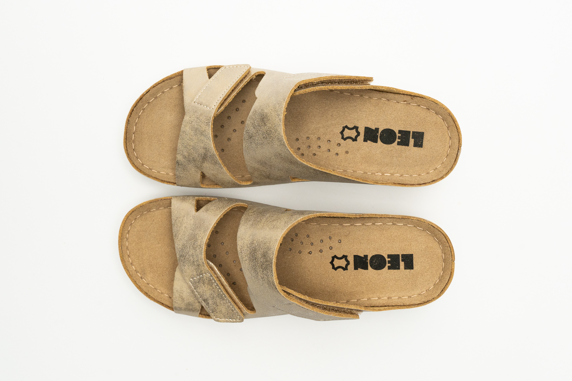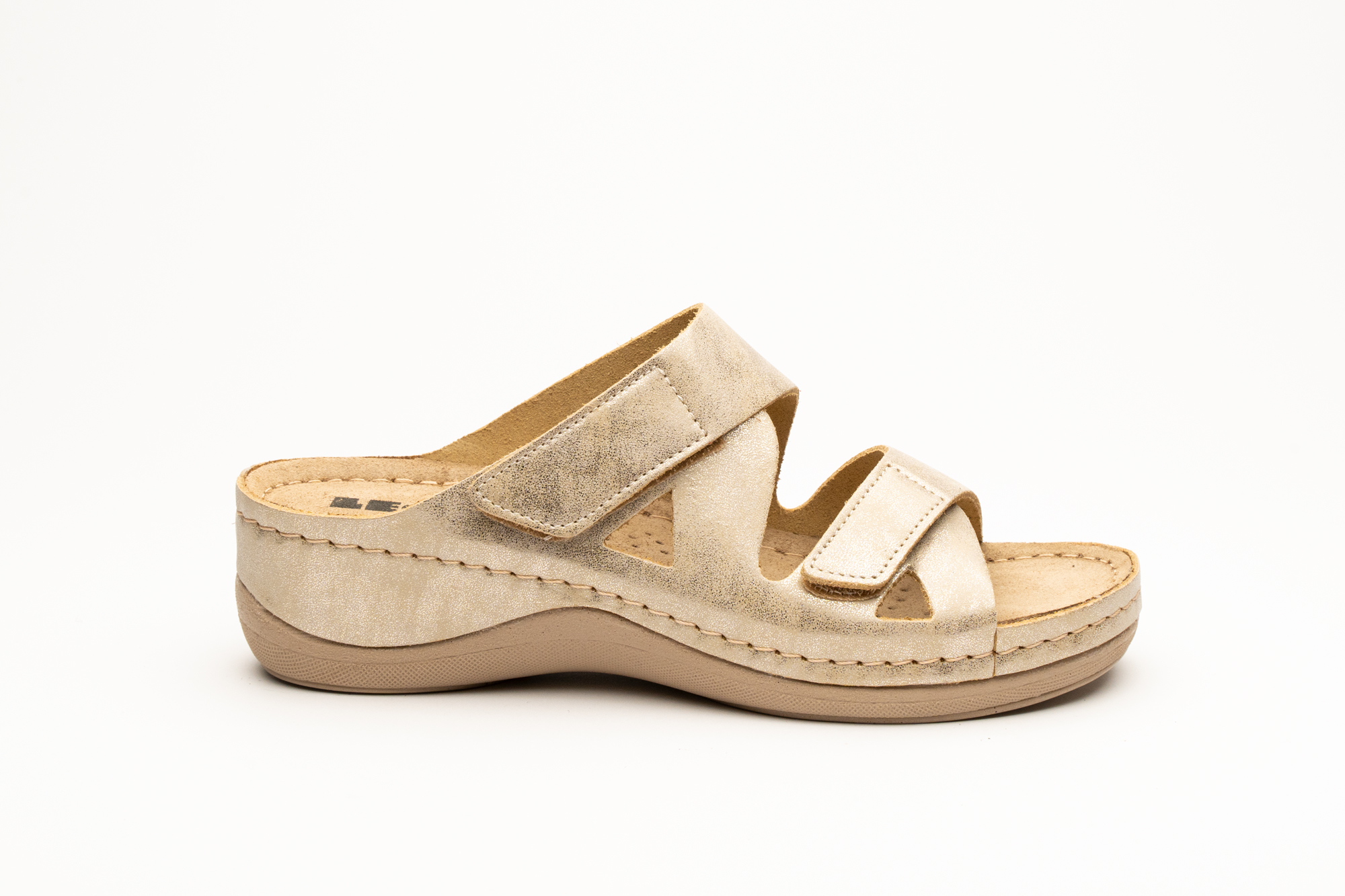 Дамска чехла, изработена от естествена кожа с кожена стелка, съдържаща масажиращ гел. Подметката е от полиуретан с противохлъзгаща вложка, която предотвратява плъзгането. Горната част е с велкро закопчаване за регулиране.